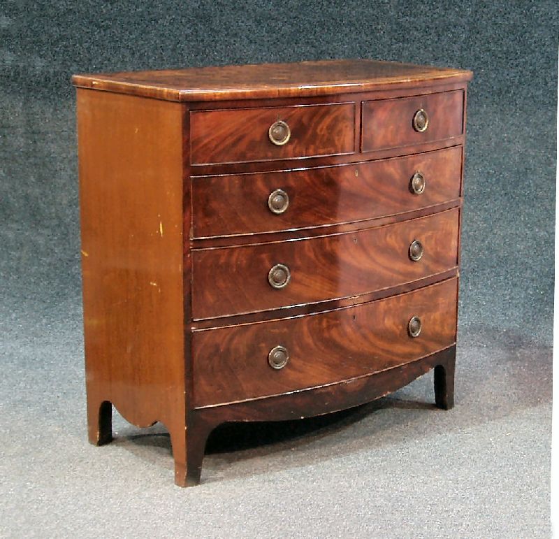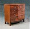 with parque veneered top above two short over three graduated cock-beaded long drawers, serpentine apron, raised on splayed feet