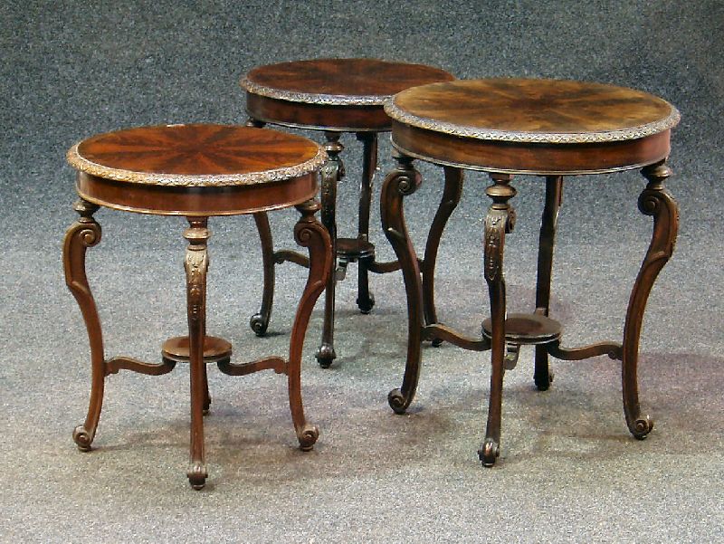 each with circular top with foliate carved rim, over a plane frieze carved cabriole legs terminating in C-scrolls united by a single shelf (3)