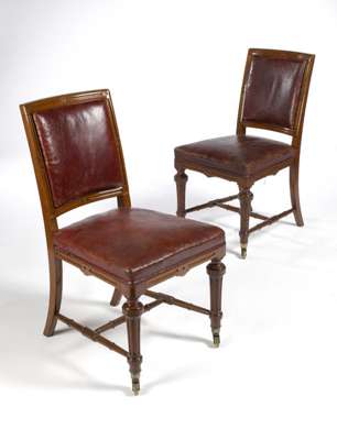 the rectangular framed and padded backs with channelled decoration above stuffover seats with similarly shaped and channelled rails, on turned and fluted tapering legs united by turned H-stretchers, burgundy hide upholstery, the seat rails stamped HOLLAND & SONS verso(6)
