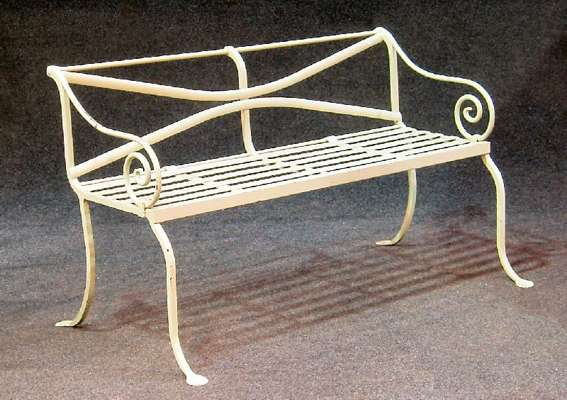 with X-frame back, over slatted seat open arms, raised on sabre legs