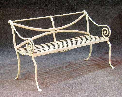 with X-frame back, over slatted seat open arms, raised on sabre legs