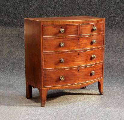the boxwood strung top over boxwood strung frieze, two short over three graduated cock-beaded long drawers, shaped apron, bracket feet