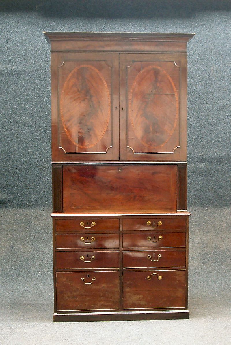 the projected moulded cornice over two oval paneled doors, fall-flap flanked by fluted columns, two banks of three short drawers,deep cupboard, on plinth base