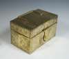 of rectangular form with riveted fixings and carrying handle, decorated with an allover incised design of flowering plants and enclosing a wood-lined interior
