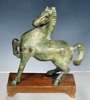 the horse rearing with head back and one foot raised, on a stained hardwood stand
