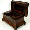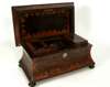 of sarcophagus form, the hinged lid opening to reveal a fitted interior above waisted sides, raised on turned bun feet
