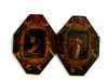 of elongated octagonal form, one painted with a romantic scene of lovers, the other a bacchic group, reserved against an ornate crowned scrolling foliate and drapery painted ground (2)