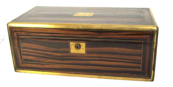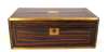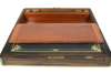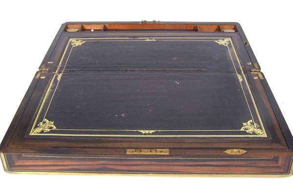the hinged lid enclosing a compartmented leather inset writing surface and two inkwells