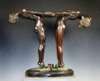 of a man and a woman holding hands and bending backwards, on an oval base, with painted green foliage