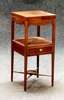 the bi fold top enclosing bowl and dish recesses above an undershelf with frieze drawer, on square tapering legs united by a ewer stand