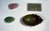 comprising: a pierced rectangular plaque with intricate scene of a deer and dragon in a forest; a jade carving of a lotus flower; an oval bowl with single foliate and flower head handle; and a rose quartz flower head (4)