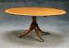 the crossbanded and boxwood and ebony lined moulded oval top raised on tapering turned support, quadruped reeded sabre legs on brass paw caps and castors