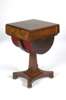 the drop leaf top with fitted frieze drawer and wool drawer on a U-shaped support and square tapering column, on platform base with bun feet