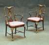 the serpentine top-rail over a solid vase splat, drop-in seat, open arms, raised on cabriole legs and pad feet (2)