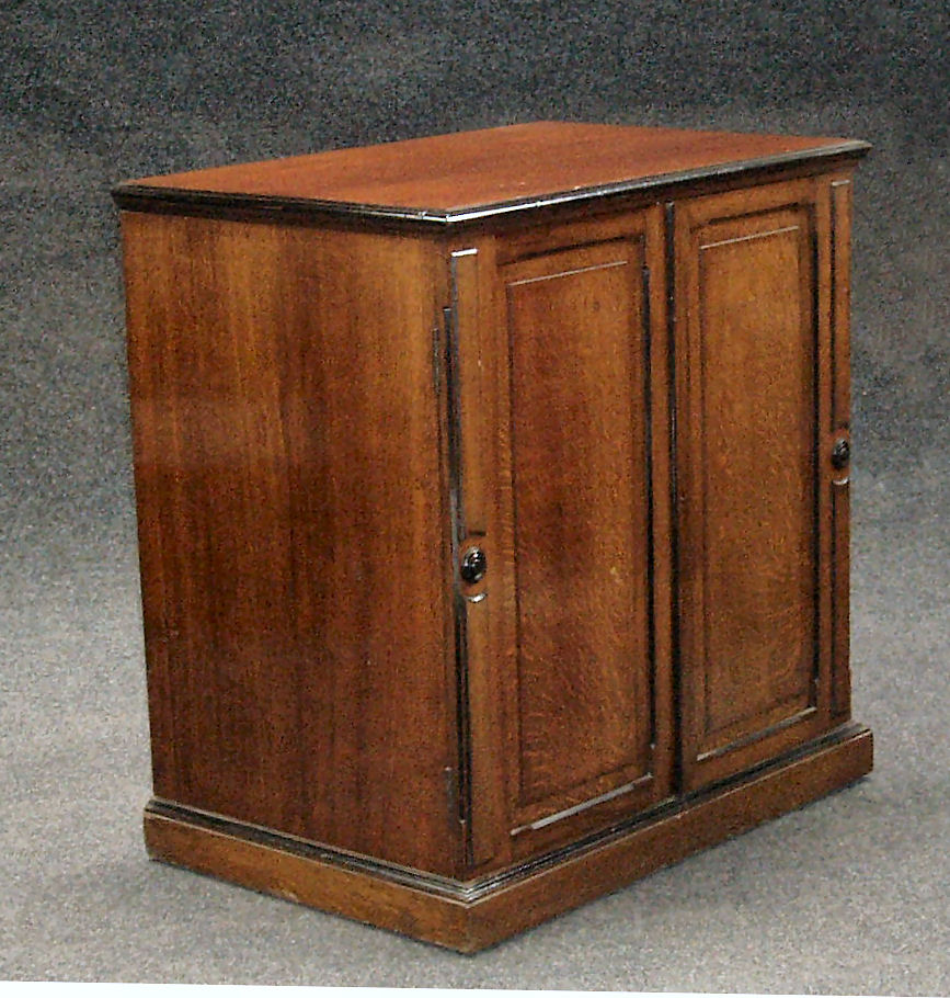 the moulded rectangular ebonised banded top over two panelled doors enclosing metal lining, graduated drawers raised on plinth base