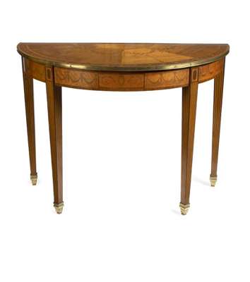 A George III satinwood, purpleheart and tulipwood crossbanded demi-lune table, circa 1775