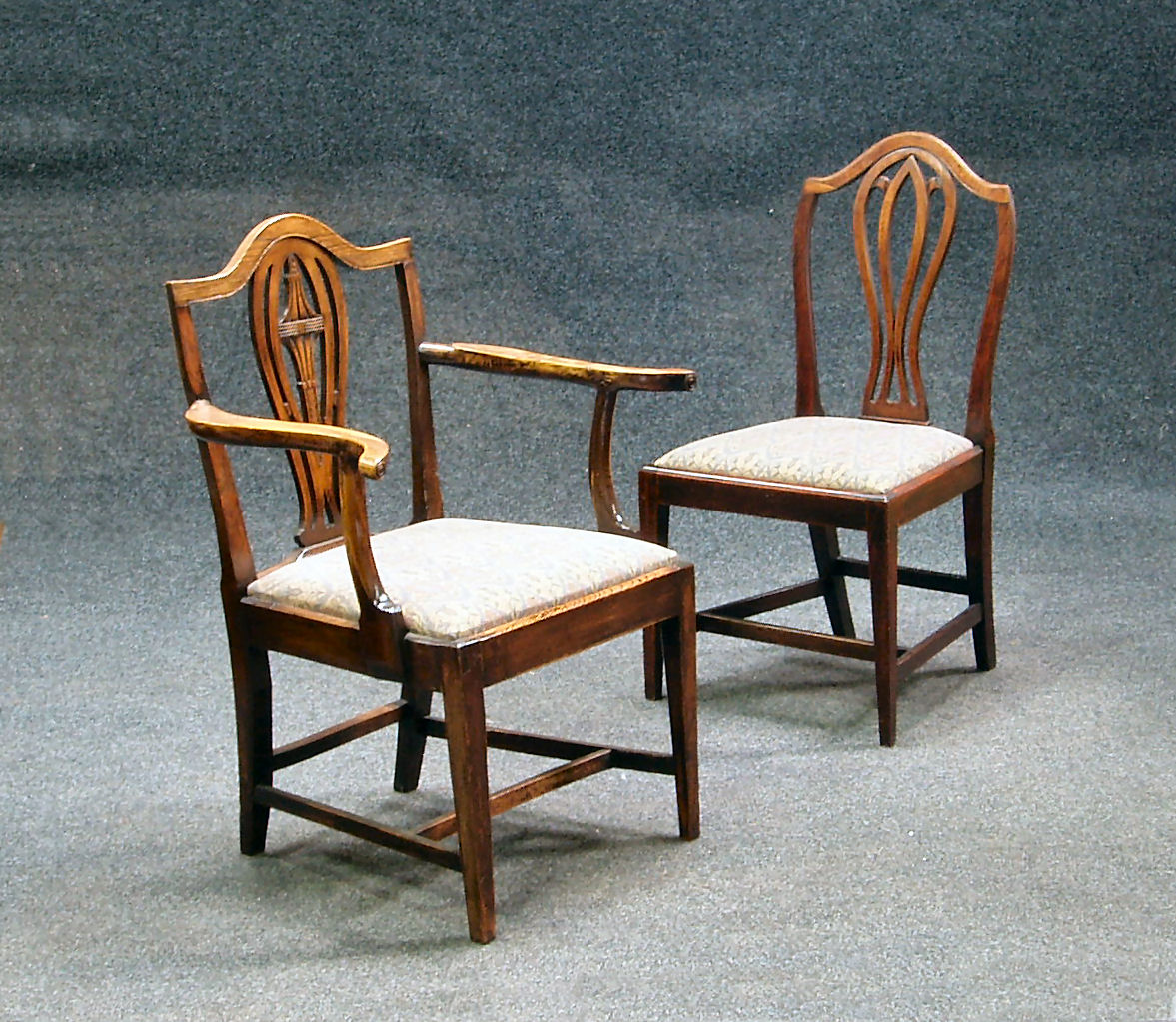 each with arched top-rail over open vase shaped splats drop-in cushioned seat, square tapering legs united by stretchers; including a matched Georgian elm and birch carver (10)