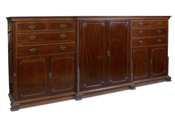 of large proportions, the rectangular top with dentil frieze above a pair of leaf carved panel doors enclosing slides flanked by side cabinets, each having two short over two long drawers and a pair of beaded cupboard doors, the whole divided by fluted and blind fret carved pilasters on skirted plinth base with ogee bracket feet