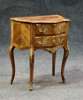 the moulded crossbanded top over two drawers with serpentine apron, cabriole leg with brass sabots