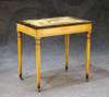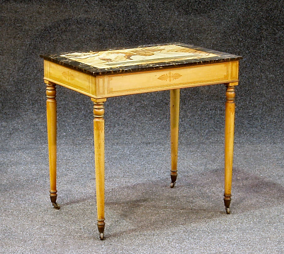 the rectangular faux marble top decorated with a sphinx next to an open book and flaming brazier, the frieze and turned legs painted with faux bandings and anthemia on a yellow ground, ending in brass socket castors