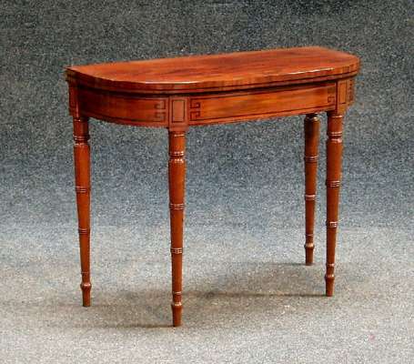 the ebony strung D-shaped top over ebony strung frieze raised on tapering ring turned legs