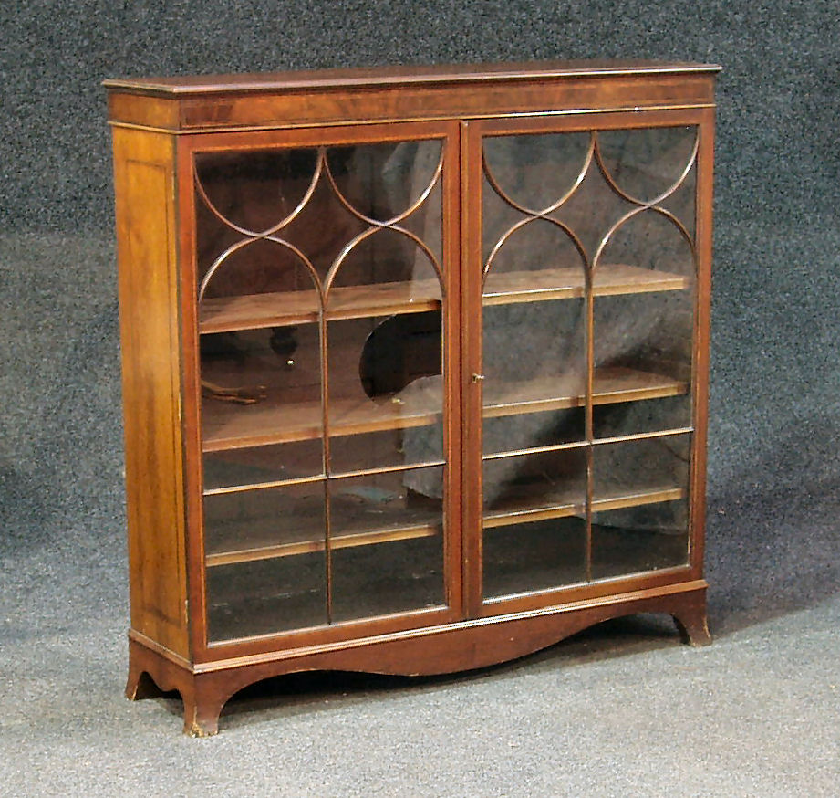 the moulded rectangular top over a boxwood and ebony strung frieze panel, two astragal glazed doors enclosing adjustable shelves, serpentine apron splayed bracket feet