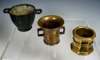 a bronze example, possible Japanese, of tapered circular form with twin loop handles, 11cm high; an 18th century brass example of tapered cylindrical from with everted flared rim, with simple incised decoration and two angular handles, 9.5cm high; and an 18th century brass octagonal example with girdle to body and stepped base, 8.5cm high (3)