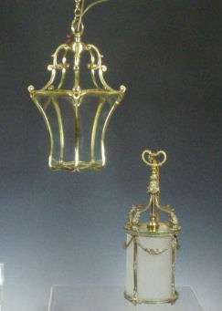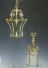 surmounted by four acanthus leaf supports, the body decorated with swags and floral rosettes, with circular frosted glass shade, 40cm high; and a 20th century brass hall lantern, surmounted by double C-scroll supports, above the five sided tapering moulded body, with glass panels, 40cm high (2)