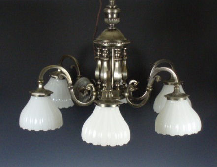 leaf design finial, the body constructed from six hexagonal tapering columns, the C-scroll and S-scroll branches with opaque moulded glass shades