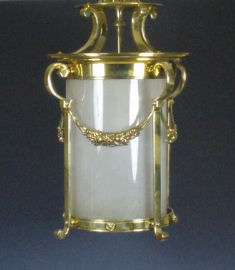 surmounted with reeded hoop and four C-scroll supports, the circular lantern with swags and circular opaque glass