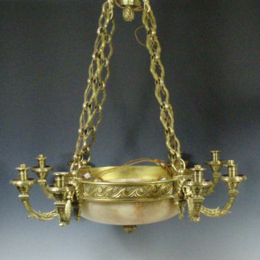 the three chain fittings over a marble bowl, the gilt frame with four twin branches, scroll frieze and acanthus decoration
