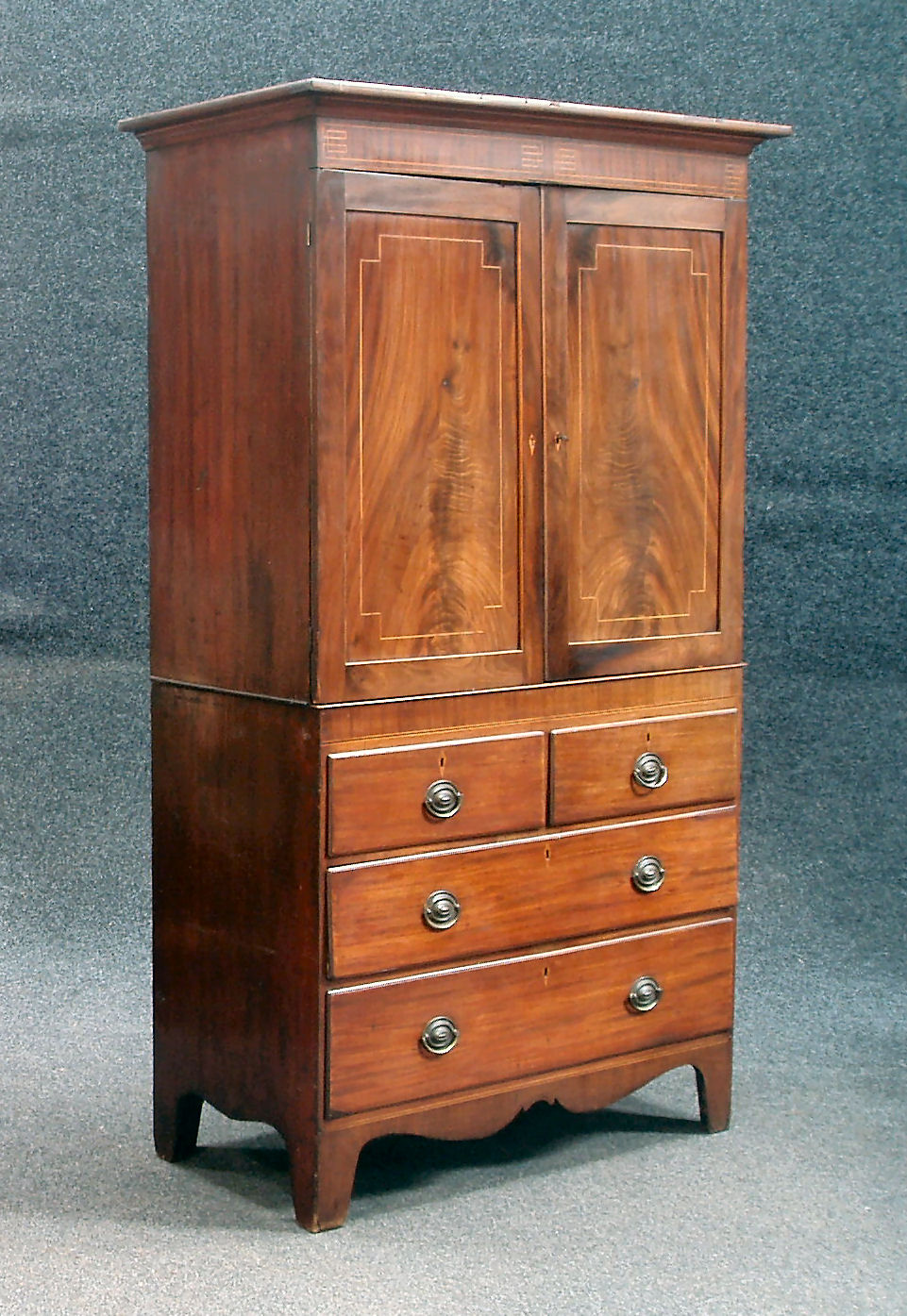 the projected moulded cornice over a boxwood strung frieze two panelled doors, two short over two graduated long drawers serpentine apron raised on bracket feet