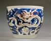 to tapered body with blue and red painted decoration with dragon, running horses and other creatures on a blue swirl background