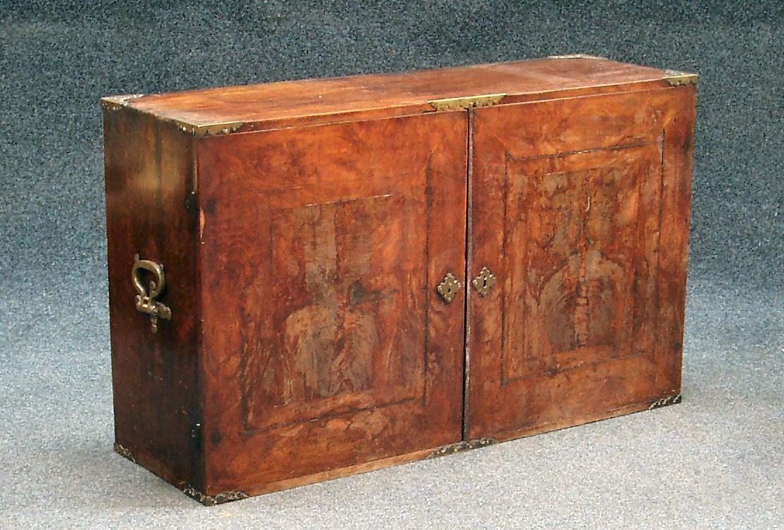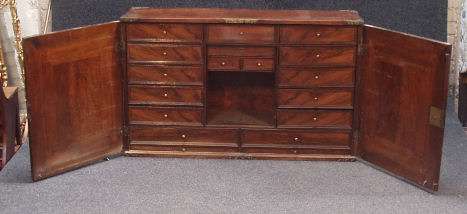 the rectangular top over two doors containing an arrangement of drawers, flanked by large brass handles