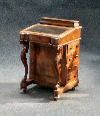 the moulded top over hinged writing slope with skiver enclosing drawers and a panelled frieze, foliate carved cabriole supports flanked by four short drawers and opposing dummy drawers raised on turned cups with castors