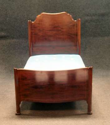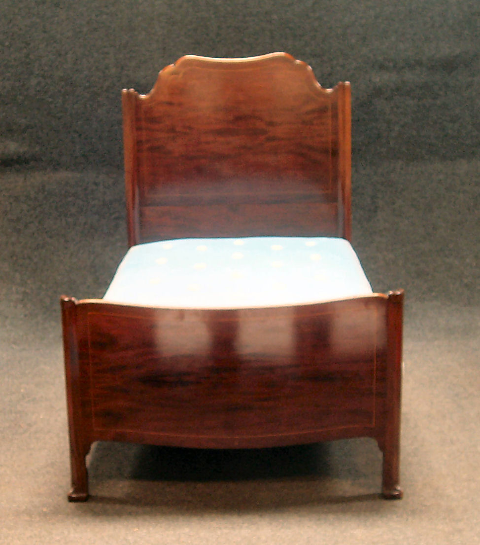 each with boxwood and ebony strung moulded shaped headboard and similar concave footboard raised on chamfered square legs with square pad feet, (2)