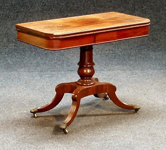 the rectangular top with beaded rounded corners raised on a tapering turned column quadruped reeded sabre legs, brass hairy paw caps and castors