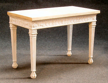 the rectangular marble top over a guilloche frieze, raised on tapering fluted square legs with claw and ball feet
