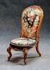 The foliate carved arched back over embroidered cushioned back and seat, carved apron, acanthus carved cabriole legs terminating in C-Scrolls, brass castors