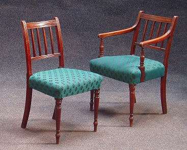 each with reeded top rail over matching vertical splats and uprights, cushioned seat, raised on tapering baluster turned legs; include a carver (6)