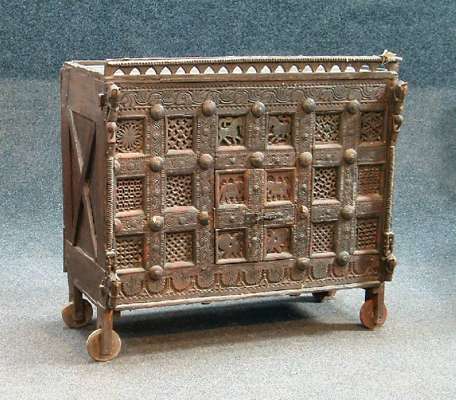 the pierced pediment over carved panels of elephants, horses, geometric shapes, two small doors, raised wood wheels