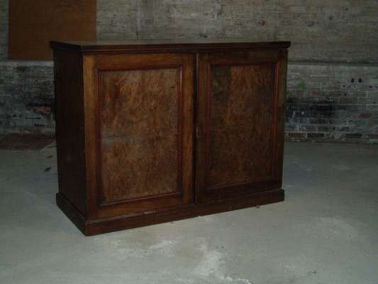 the moulded rectangular top over two panelled burr walnut doors one enclosing two drawers and six slides the other hanging space on a plinth base