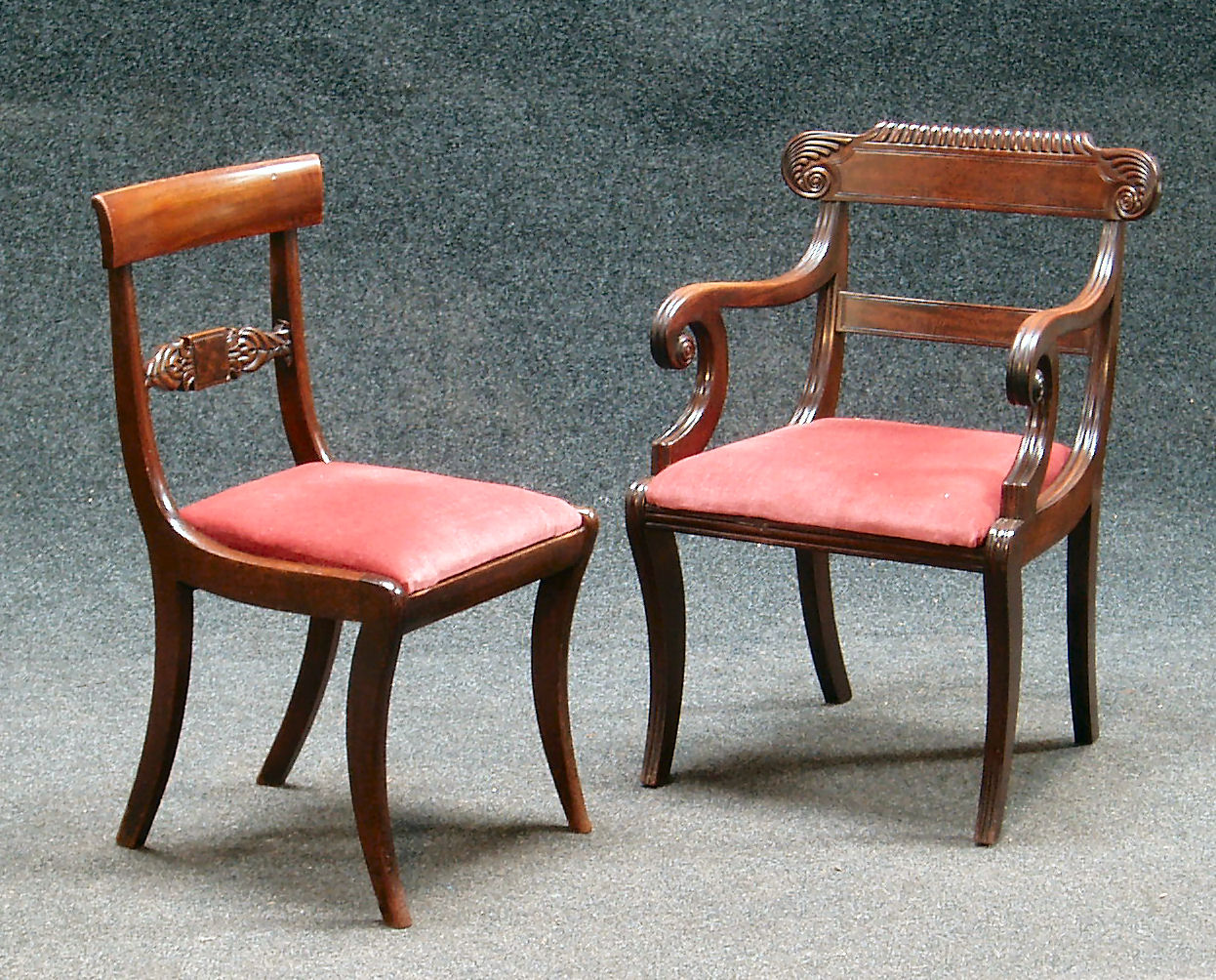 the reeded top rail with scroll ends, drop in seat, and reeded sabre legs; including a carver (7)