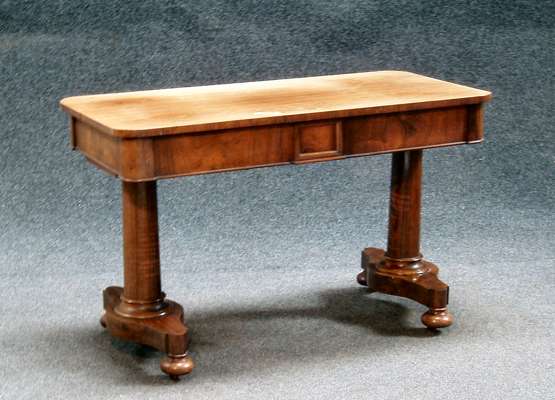 plain frieze, with two drawers, above two thick turned legs, with banjo shaped base and bun feet