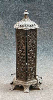 the cover with knopped finial above sides pierced with arabesques and Gothic tracery, on rococo cast leaf scroll feet, fitted for electricity