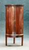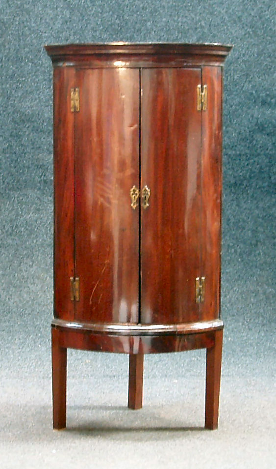 the cavetto cornice above a pair of doors on brass H-hinges with rococo pierced escutcheons and enclosing shaped shelves, on later stand with square section legs