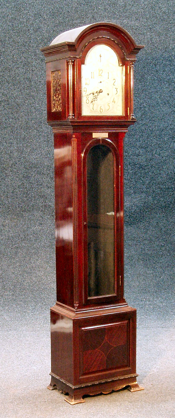 the arched and engraved silvered dial with Arabic chapters and subsidiary chime/silent and seconds dials, with westminster and whittington chime lever to side, the glazed trunk door between fluted quadrant corners, on panelled plinth with shaped apron and splayed bracket feet, a plaque dedicated to Lieut. Col. T.C.R. Moore (of Airdrie - a Unionist General Election Candidiate) dated 1924, chiming on nine bar gongs