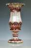 with everted scalloped rim with faceted baluster body, on knopped stem with simple faceted foot rim, decorated throughout with ruby and opaque overlay