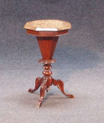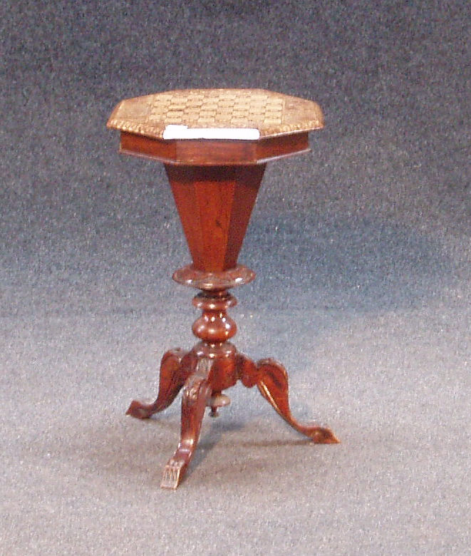 of tapering octagonal form, the hinged cover enclosing fitted interior, on leaf carved tripod base