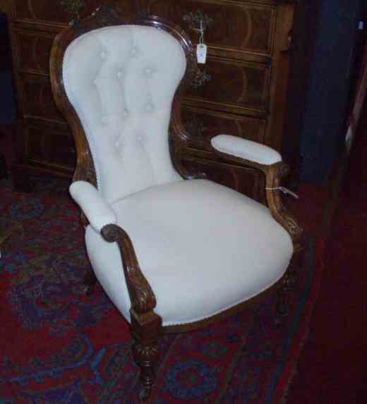 A mid-Victorian walnut framed spoon back armchair by Holland & Sons